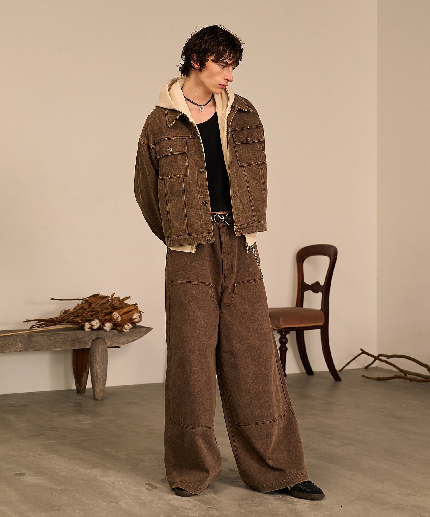 ダブルニー仕様にスタッズを打ち込み、シルエットは極太のバギーシルエット。